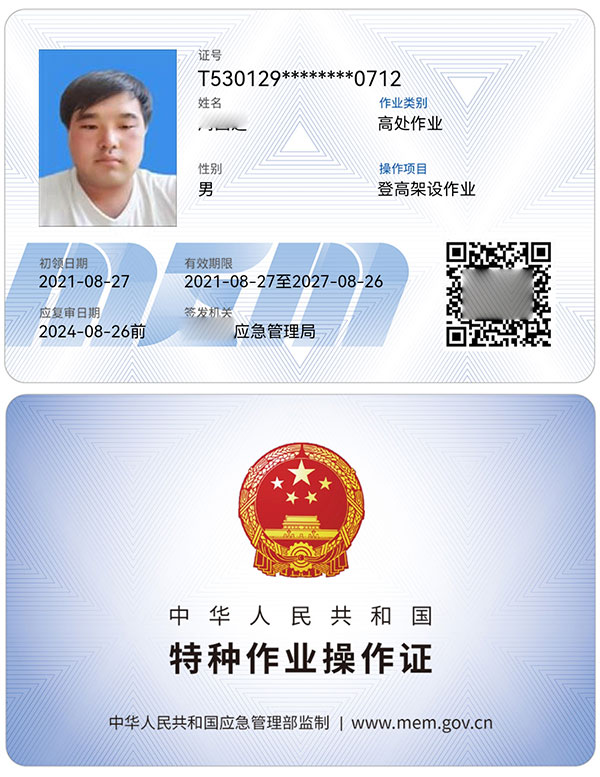 特種作業操作證:高處安裝、維護、拆除作業