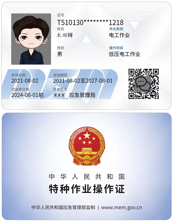 電工特種上崗操作證由應急管理部   頒發,哪里發的都可以通用的,以前叫IC卡,現在叫感應卡,3年年審一次,和身份證一樣的,只要你有專用的讀卡機,就能夠讀出卡里面的資料,但是這個讀卡機國家只給有資質的單位,比如學校,原安監,局應急管理局現等才有,這證不管你拿去哪里,只要有讀卡機的地方都可以讀卡與年審,查詢方式也可以上發證部門應急管理局的網站,上輸入證號查詢的。