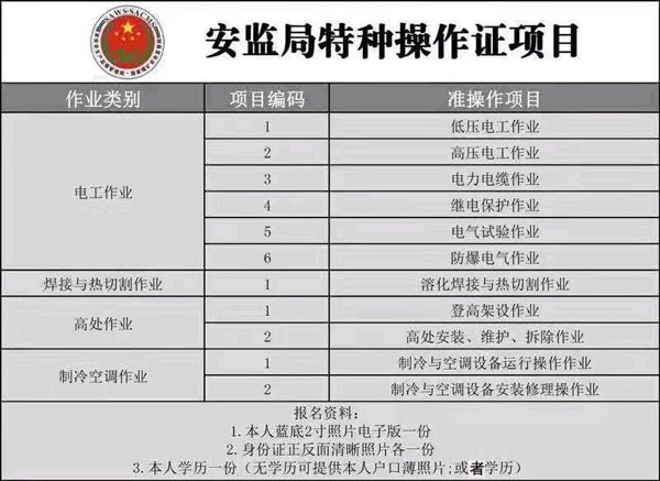 南充市應(yīng)急管理廳(原安監(jiān)局):低壓電工證,高壓電工證,焊工證-熔化焊接與熱切割作業(yè),電工證-電力電纜,電工證-繼電保護(hù),電工證-電氣試驗(yàn),防爆電氣作業(yè),高處安裝維護(hù)拆除作業(yè),登高架設(shè)作業(yè),制冷與空凋設(shè)備運(yùn)行操作作業(yè),制冷與空凋設(shè)備安裝修理作業(yè),施工吊裝作業(yè),施工挖裝作業(yè),危化品負(fù)責(zé)人/管理人員,危化品從業(yè)人員上崗證,特種作業(yè)人員必須經(jīng)專門的安全技術(shù)培訓(xùn)并考核合格,取得《中華人民共和國特種作業(yè)操作證》(以下簡稱特種作業(yè)操作證)后,方可上崗作業(yè)。