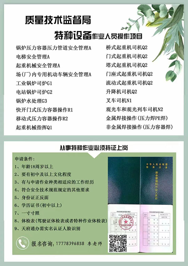 《特種設備作業證》工種:,特種安全設備管理A,起重機指揮Q1,起重司機(限門座式起重機)Q2,起重司機(限門式起重機)Q2,起重司機(限纜索式起重機)Q2,起重司機(限塔式起重機)Q2,起重司機(限流動式起重機)Q2,起重司機(限升降機)Q2、叉車司機N1,觀光和觀光列出司機N2,電梯維修T,鍋爐壓力容器壓力管道管理A、,電梯管理A,工業鍋爐司爐G1,鍋爐水處理G3,快開門式壓力容器操作R1,移動式壓力容器充裝R2,氣瓶充裝P